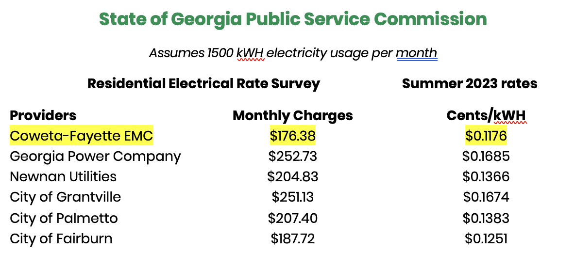 Below is a list of the electrical providers in the Coweta-Fayette EMC service area and we are the least expensive of the suppliers in our area.